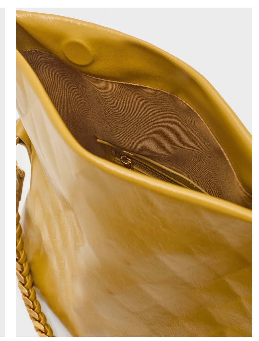 Borsa a tracolla dalla linea morbida con catena decorativa e chiusura a patta, perfetta per abbinamenti versatili e di tendenza.